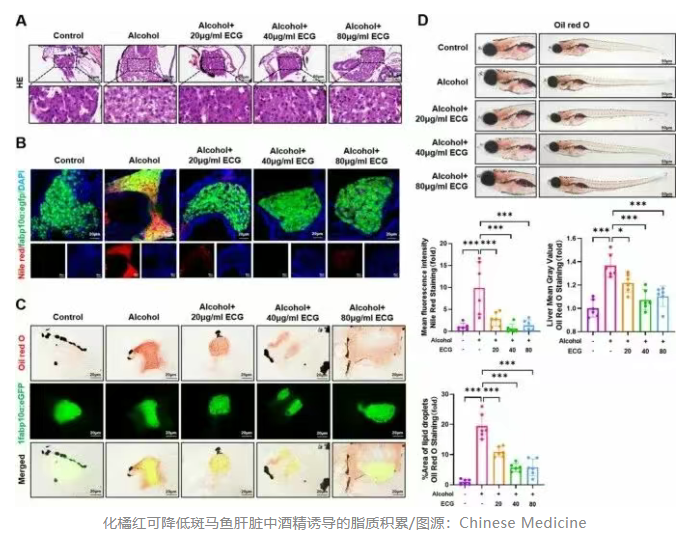 结果发现,20、40和80 微克/毫升的化橘红均能不同程度地降低酒精诱导的斑马鱼肝脏脂质积累。与对照组相比,化橘红组的脂肪肝程度显著降低。