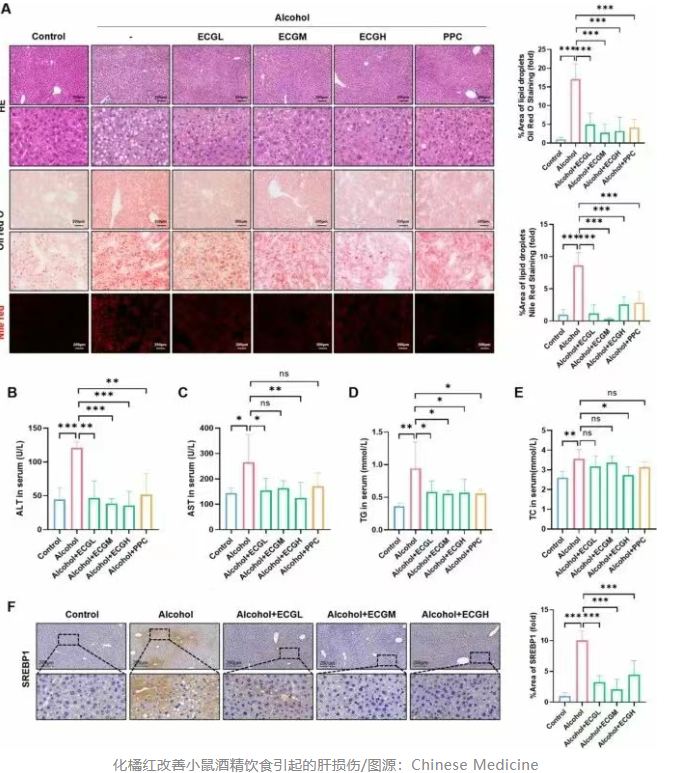 小鼠模型中,化橘红干预显著减少了小鼠肝组织中空泡和脂滴的聚集,降低了血清ALT和AST的表达水平。此外,化橘红干预逆转了酒精诱导的小鼠模型中SREBP1表达的升高,表明化橘红能有效减少酒精引起的肝脏脂质蓄积。