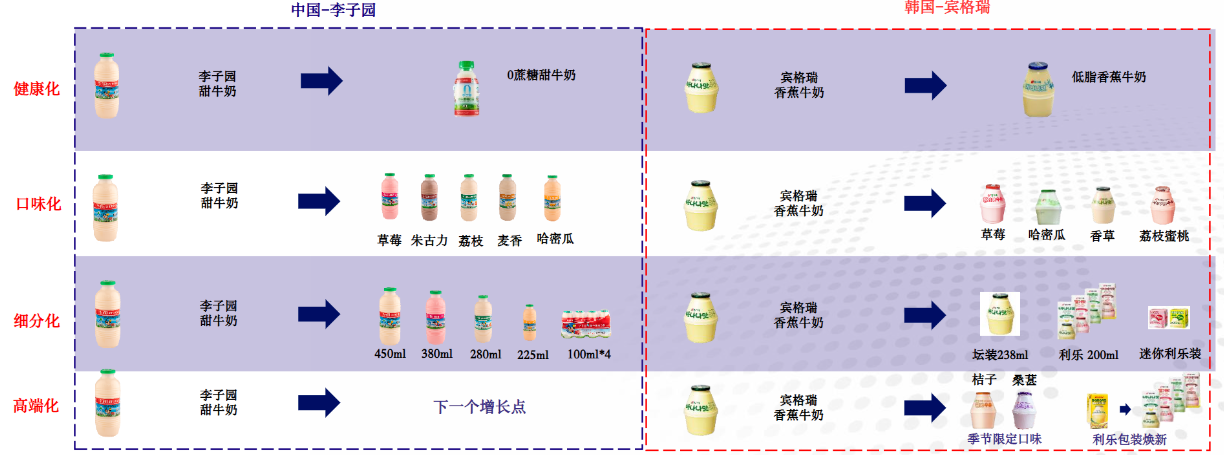 韩国宾格瑞的案例,给予国内企业不少借鉴。其主要通过产品裂变和产品扩张方式来拓展市场空间,已形成以大单品香蕉牛奶为主,各产品线百花齐放的品类格局。