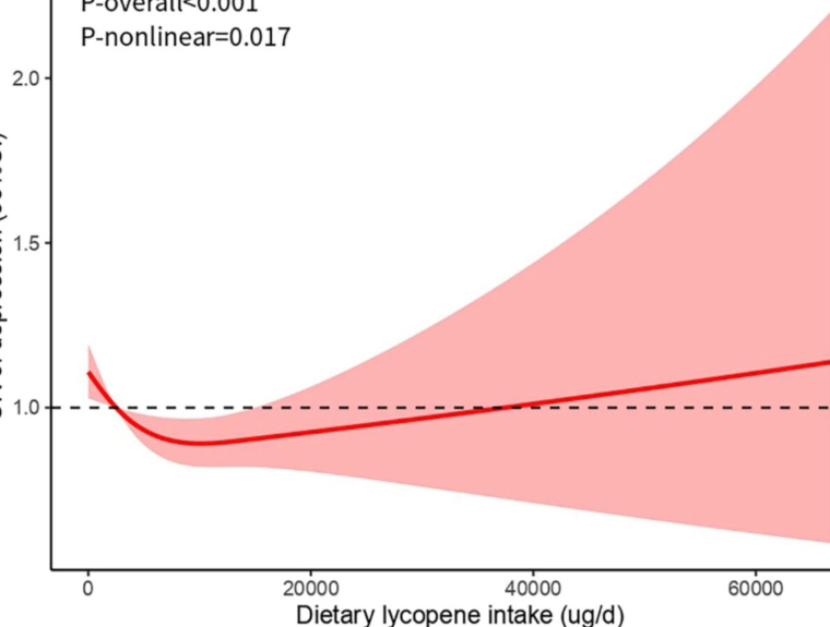 研究还采用二元逻辑回归和限制性三次样条(RCS)模型评估二者之间的关系。在校正潜在混杂因素后,分析表明,在0-10,072μg/天的摄入范围内,较高的膳食番茄红素摄入量与逐渐降低的抑郁症风险相关,这与二元逻辑回归的结果一致。然而,超过此阈值后,膳食番茄红素摄入量的进一步增加反而会逆转降低抑郁症风险的益处。