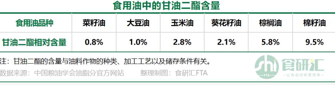 据中国粮油学会油脂分会统计,食用油中的甘油二酯含量通常在10%以下。棉籽油中的甘油二酯含量相对较高,可达9.5%。
