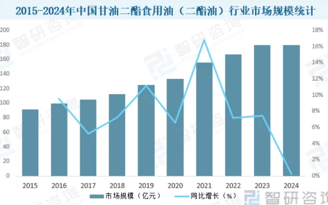 我国甘油二酯食用油行业市场化进程始于2019年,发展历程虽短,但增长极为迅速。智研产业研究院数据显示,至2024年,其市场规模已高达179.77亿元。目前,国内已有金龙鱼、长寿花、善百年等多家企业推出甘油二酯食用油。其中,善百年的甘油二酯食用油年销量已达到了千万瓶。