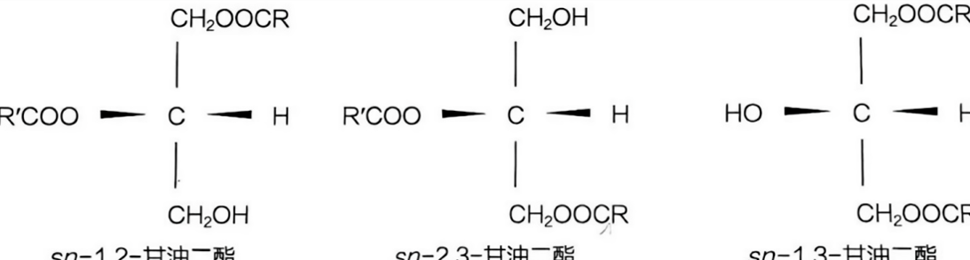 甘油二酯(diacylglycerol, DAG)是一个由丙三醇(甘油)与两个脂肪酸(油酸、亚油酸、硬脂酸、软脂酸)酯化后得到的产物。根据脂肪酸与甘油上羟基结合位置差异性,可得到三种甘油二酯异构体,即sn-1,2-甘油二酯、sn-2,3-甘油二酯和sn-1,3-甘油二酯。