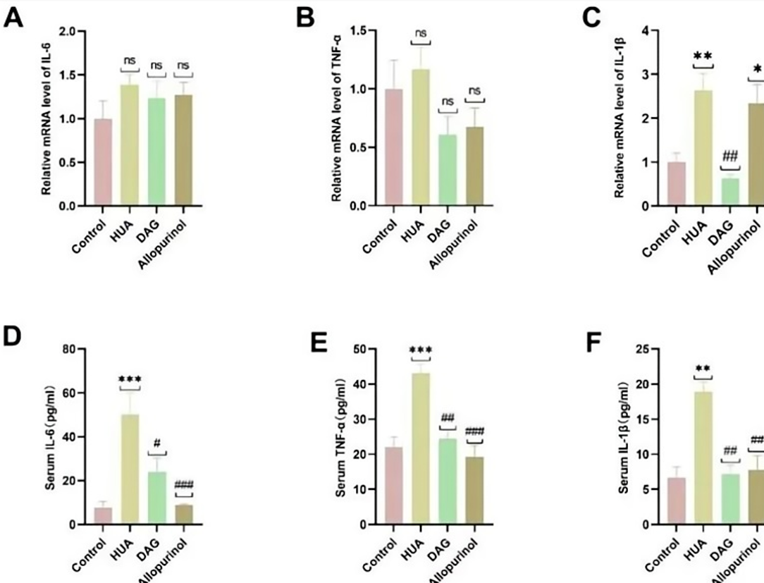进一步研究发现,甘油二酯对高尿酸血症具有抗炎作用。表明甘油二酯油能够通过双重调控尿酸转运体与炎症小体来改善高尿酸血症。