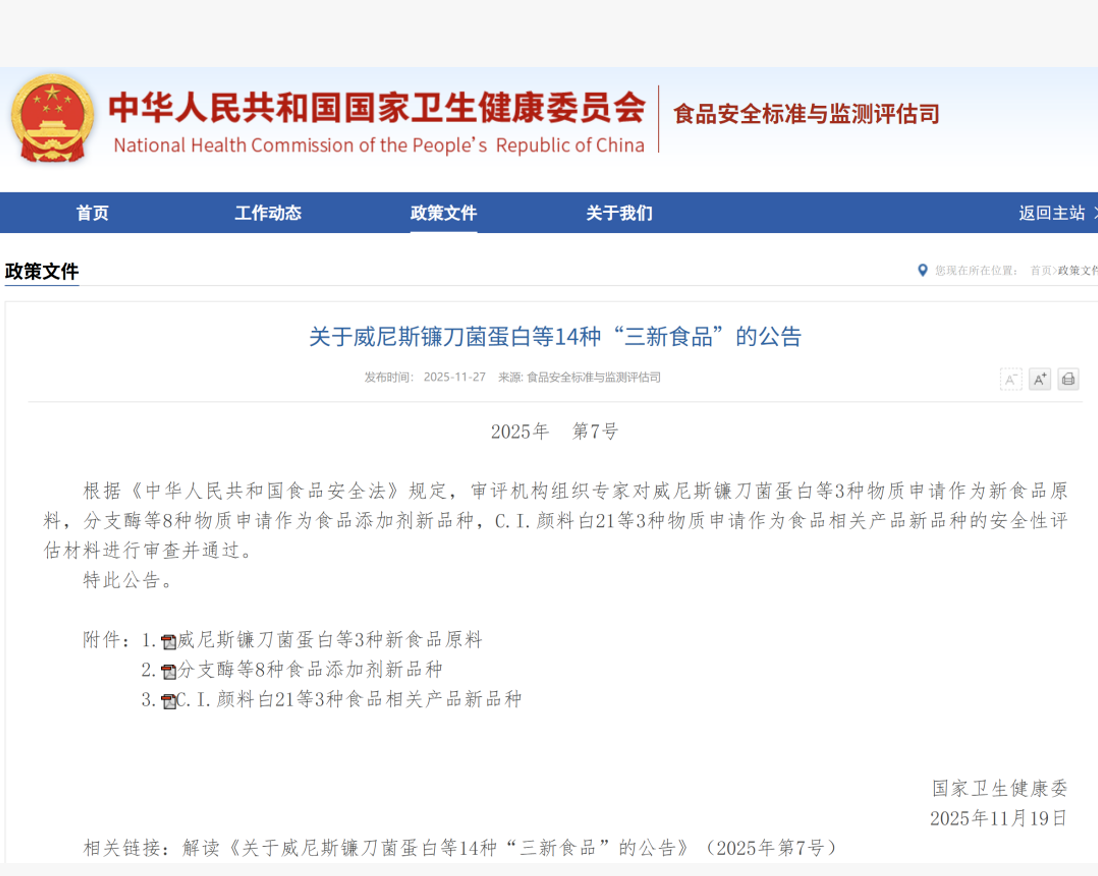 1、食品安全标准与监测评估司发布《关于威尼斯镰刀菌蛋白等14种“三新食品”的公告》