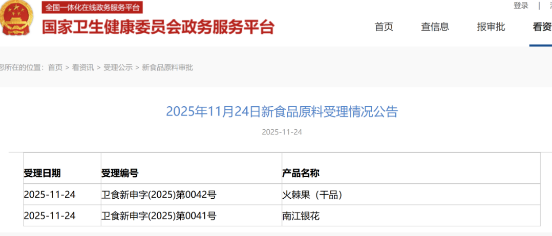 1)2025年11月24日,国家卫生健康委员会政务服务平台发布火棘果(干品)、南江银花作为新食品原料的受理情况公告。