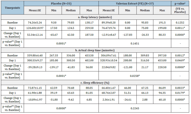 采用手腕活动记录仪对受试者的睡眠潜伏期、实际睡眠时间和睡眠效率进行评估。服用VE一天后,受试者平均睡眠潜伏期缩短27.5%,实际睡眠时间增长6.8%,睡眠效率增加2.9%。