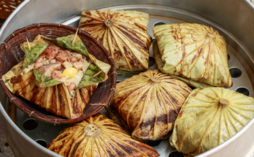 客家非遗美食荷包胙是用荷叶包着猪肉蒸出来的,广东美食糯米鸡的外层也包裹着荷叶。
